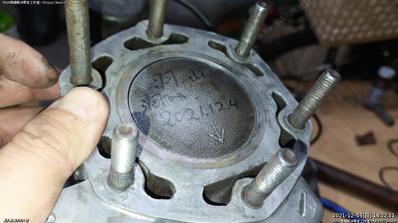 下死點,汽缸螺絲還沒鎖緊,所以下死點活塞稍微低過排氣口一些