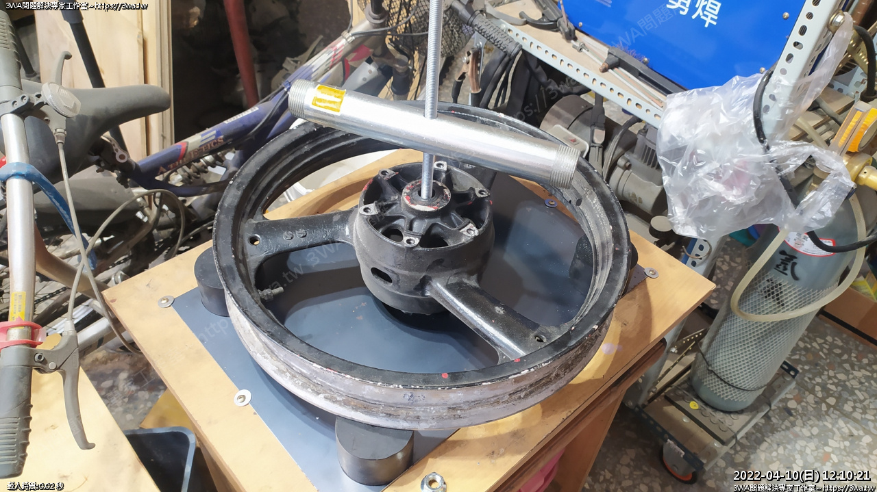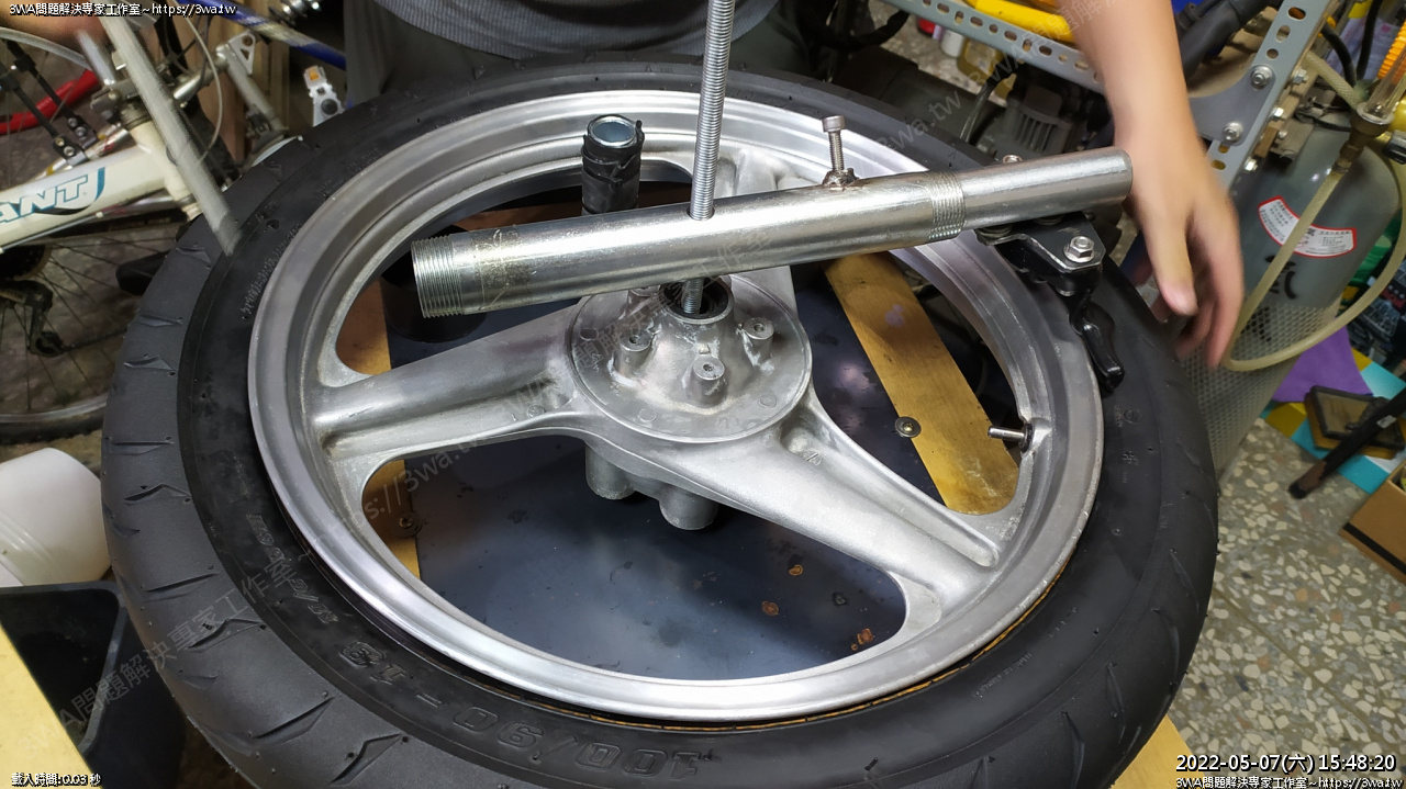 6、徒手裝胎輪框會跑,會浪費很多力氣,有自製拆胎機,不論壓胎,或是固定,都很好發力