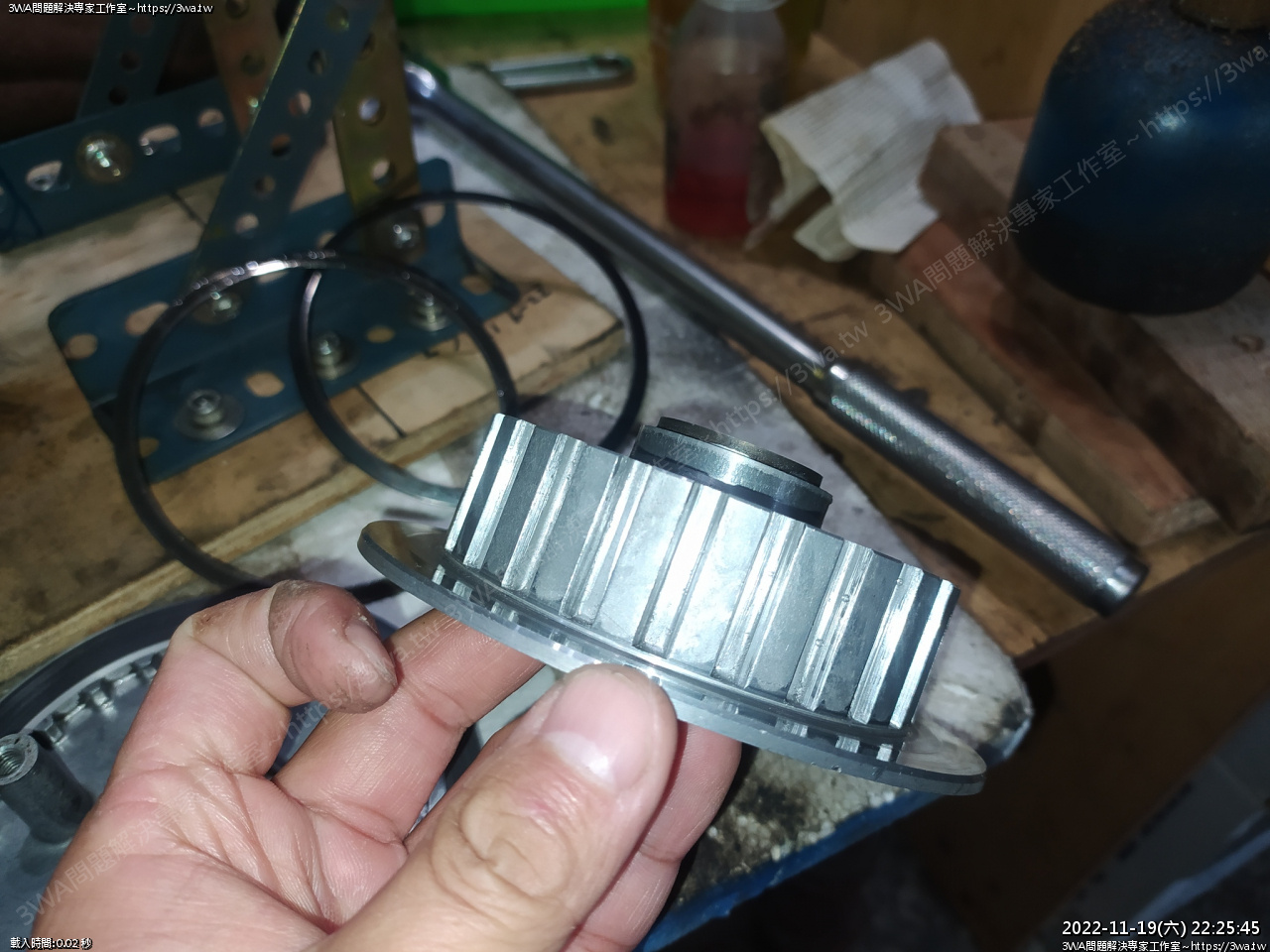 放到萬力,用木板墊著夾住齒輪