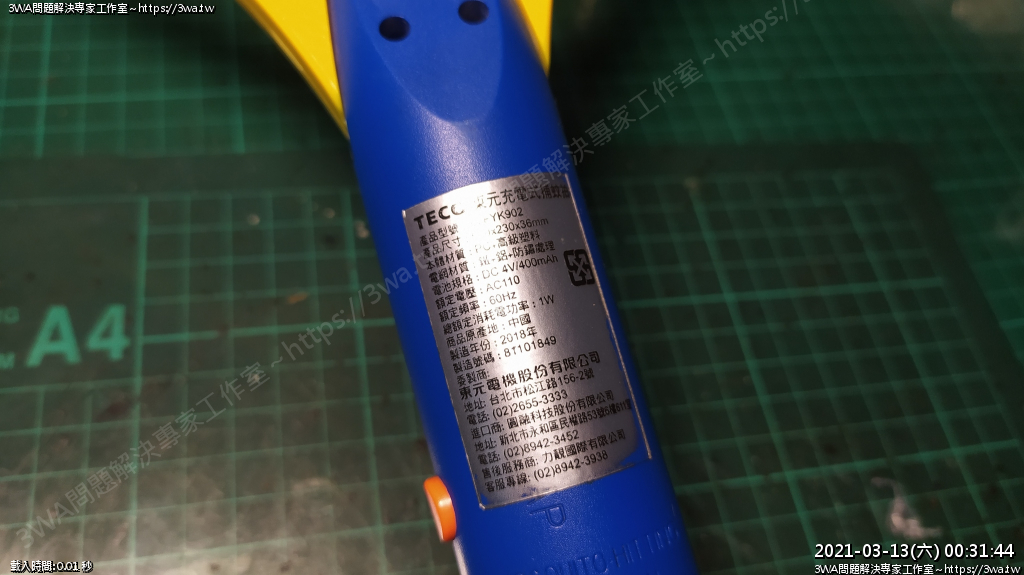 | 內容說明:2021.03.13電蚊拍更換鋰電池 | 瀏覽人數: 1237 |