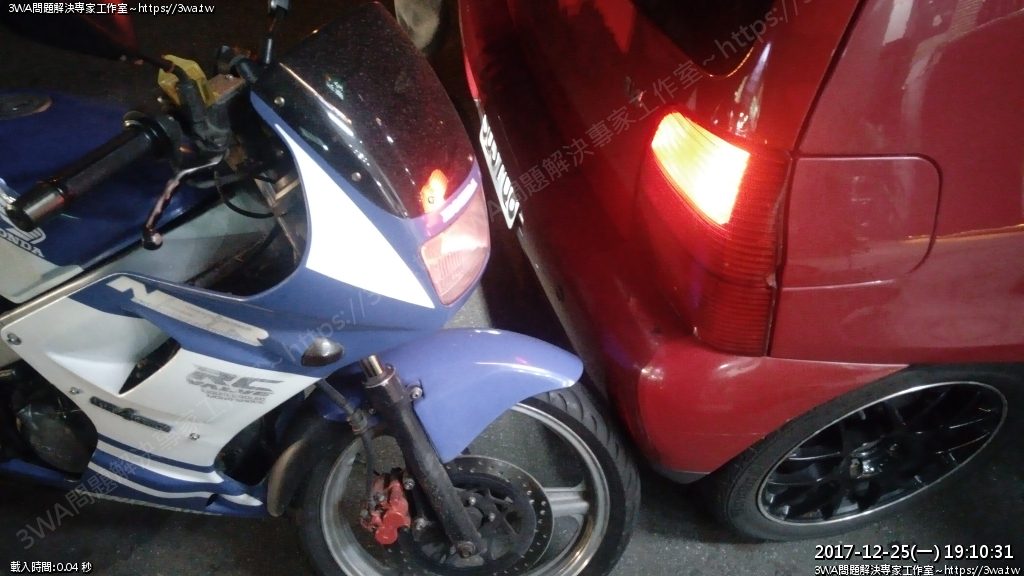 | 內容說明:2017.12.25VW退後撞到NSR | 瀏覽人數: 529 |